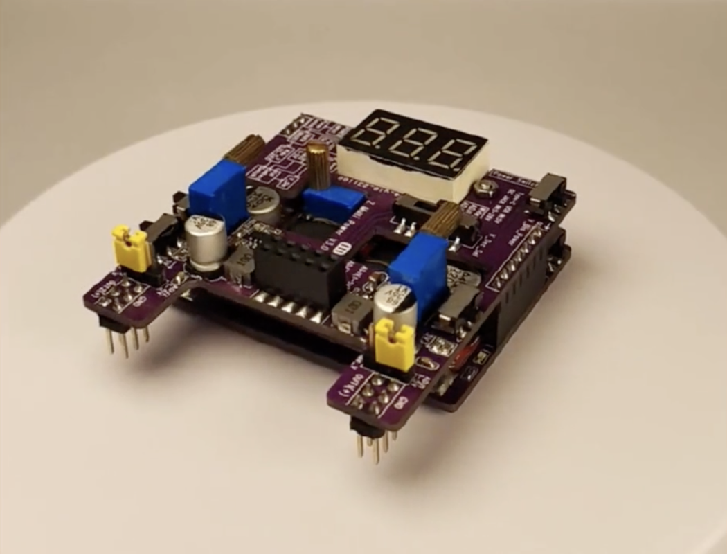 The unique supply is hosted on a small PCB with two breakout rails that connect directly to the positive and negative pins on a standard-sized breadboard. The power supply has two outputs, each of which can output up to 24V DC and both are adjustable by potentiometers. To maintain high efficiency and lower component sizes, a switch-mode design is used to provide variable DC voltage. A three-digit, seven-segment display at the top of the board keeps track of whichever output the user selects, and the supply itself can be powered by a number of inputs, including USB-C or lithium batteries.